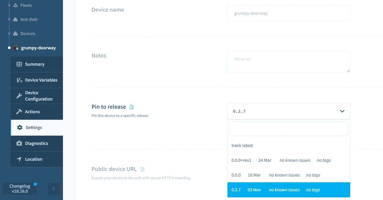 By default, all devices track the fleet release. However, you may wish to run a different release on select devices, for example, a development device or when performing a canary deployment.